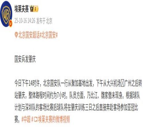 社媒原文:“今日下午14时许,北京国安队一行从聚加基地出发,下午从大兴机场飞广州之后转站肇庆,整体路程时间约为7小时。队员方面,乃比江、魏家傲未现身。根据球队计划,与深圳队的客场比赛后球队将在肇庆训练三日之后直接奔赴客场参加亚冠比赛。”