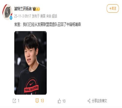 11月3日,据向阳视频,@波兰特开拓者 官宣:我们已经从发展联盟混音队召回了中锋杨瀚森。