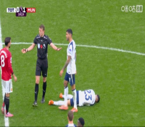 第66分钟,危险动作,里沙利松抬脚时踢中马奎尔胸口