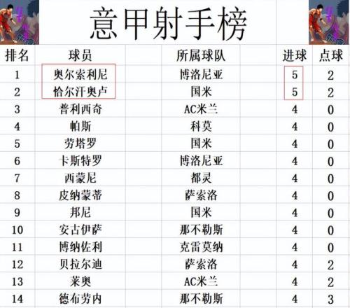 射手榜方面,意甲的射手们还是很低迷,奥尔索利尼和恰尔汗奥卢的5球都还是无人超过,他们还是并列第1。德布劳内,莱奥,劳塔罗,邦尼等12人4球并列第3。