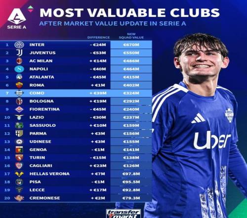 德转更新后意甲俱乐部身价排名: