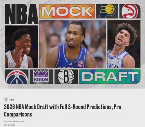 NBA权威选秀专家Jonathan Wasserman发布最新一期2026年模拟选秀榜单,卡洛斯-布泽尔的儿子卡梅伦-布泽尔暂列第二。达林-彼得森高居第一,该选秀专家预测他将在第一顺位被步行者选中。AJ-迪班萨排第三,凯莱布-威尔逊第四。