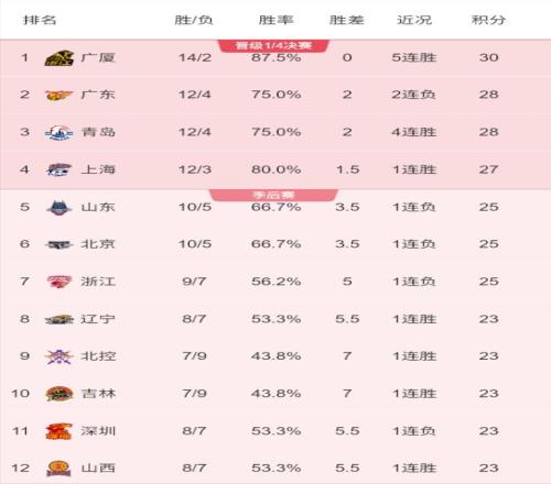 联赛积分榜前12名排名:广厦、广东、青岛、上海、山东、北京、浙江、辽宁、北控、吉林、深圳和山西。