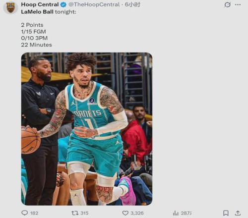 北京时间1月22日,NBA常规赛:黄蜂主场87-94不敌骑士。黄蜂球员拉梅洛-鲍尔打出本赛季最差的一场比赛:替补出战22分18秒,投篮15中1,三分10中0,得到2分5篮板7助攻2抢断1盖帽2失误4犯规,正负值-16。