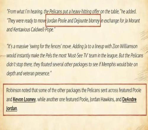 据悉,在过去一段时间里,鹈鹕管理层在追求莫兰特一事上态度非常积极,先后向灰熊提出了两套交易方案: